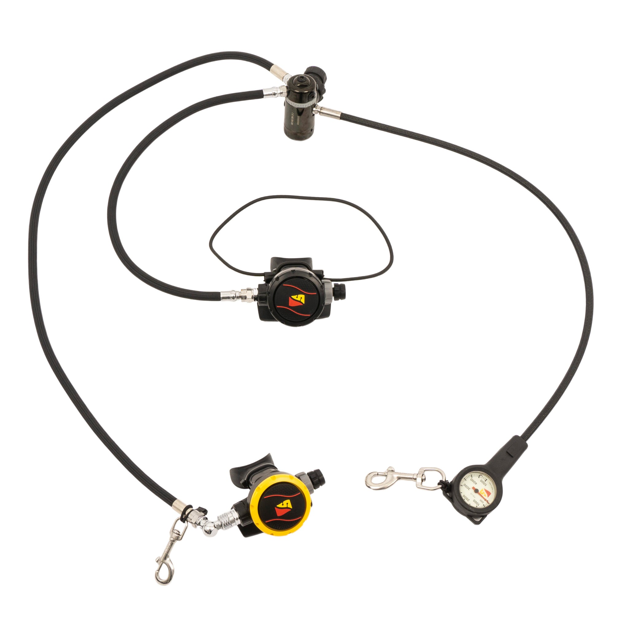 - Primary XT2 Second Stage Regulator routed under the diver’s arm on a 40-inch flex hose with an angled adapter.